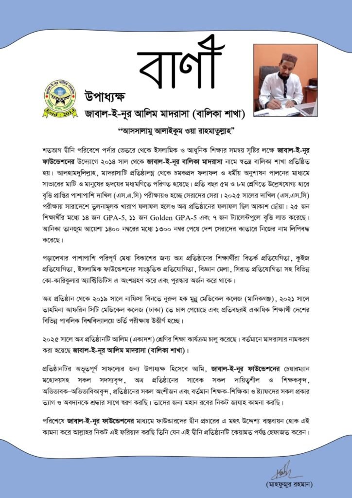 Jabal-E-Noor Balika Madrasah Messages Prospectus Get in Touch 30/16, Shahibag, (Commissioner Road), Savar, Dhaka jabalenoorbalikamadrasah@gmail.com +8801923339100 , +8801889130943